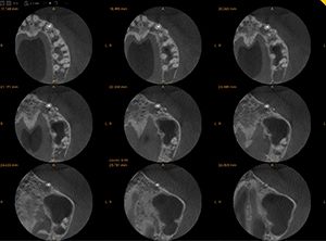 Photos 9 - 10 - 11 : Patient se présentant avec une symptomatologie douloureuse sur le secteur maxillaire gauche. Un traitement endodontique sur la 23 n’a pas permis de soulager le patient. Sur l’image tridimensionnelle, on constate la présence de la lésion sur 23, mais des doutes persistent sur la 24. Sur les coupes axiales, on valide l’étendue de la lésion sur la 23, mais aussi la fénestration de la racine vestibulaire de la 24.