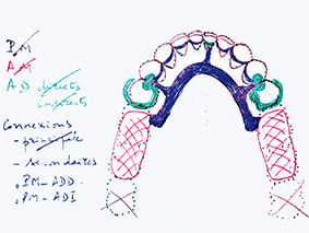 La méthodologie proposée, applicable tant au maxillaire qu’à la mandibule, est calquée sur le maquettage mené au laboratoire à partir de préformes en cire. Les différents composants se déclinent en poutre maîtresse (PM barre linguale à la mandibule, cadre à deux entretoises au maxillaire), appuis muqueux (AM-les selles), appuis dentaires directs (les crochets-ADD) et indirects (appuis sur l’arc denté antérieur dans les cas d’édentement postérieur libre-ADI) ainsi que les connexions principales et secondaires (CP et CS). Ils se dessinent dans cette même chronologie, et le tracé s’achève en décidant, en fonction de critères cliniques, de la forme de la poutre maîtresse. À la mandibule, barre linguale (BL), BL et barre cingulocoronaire ou bandeau. Au maxillaire, châssis à une ou à deux entretoises ou plaque pleine.